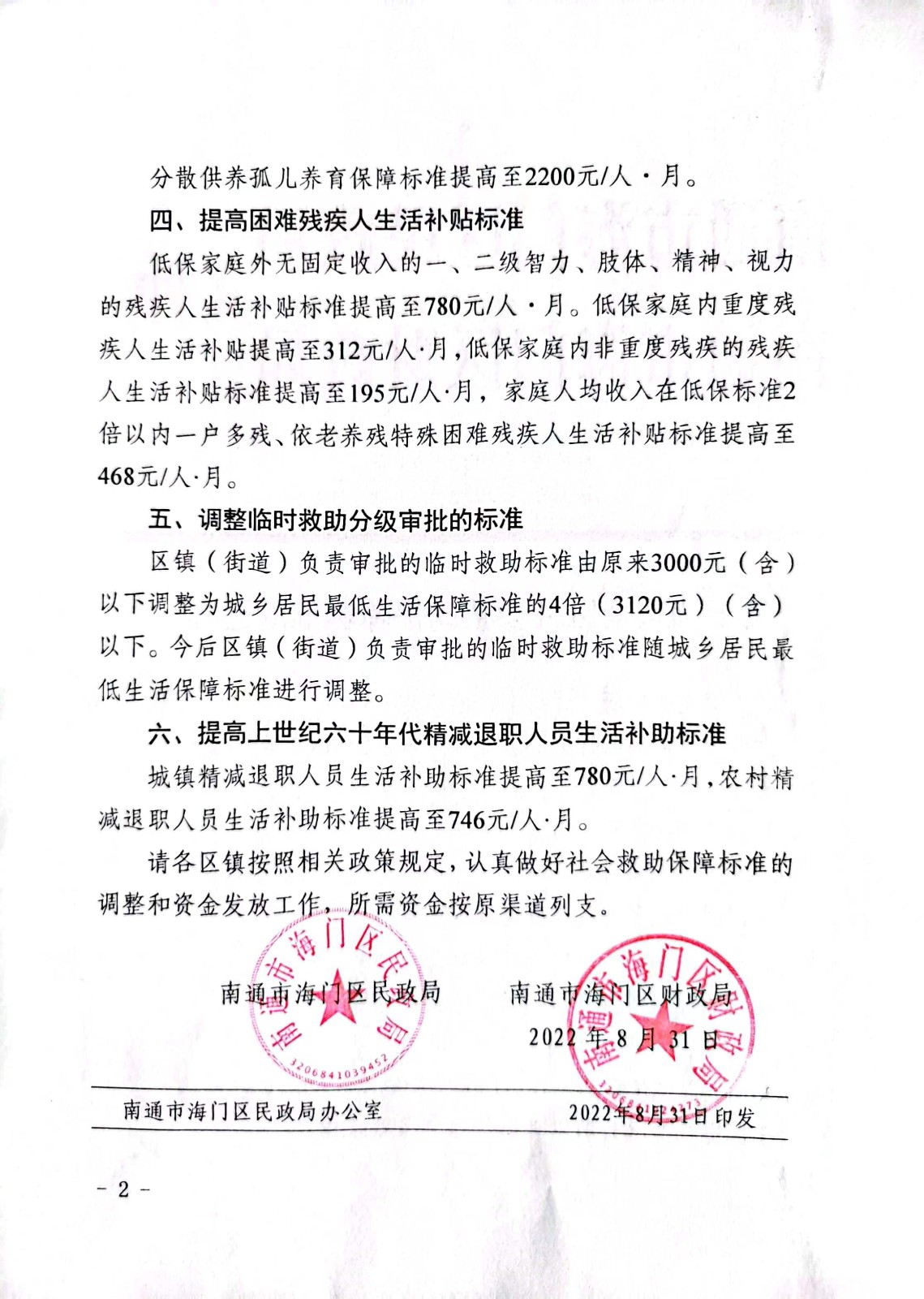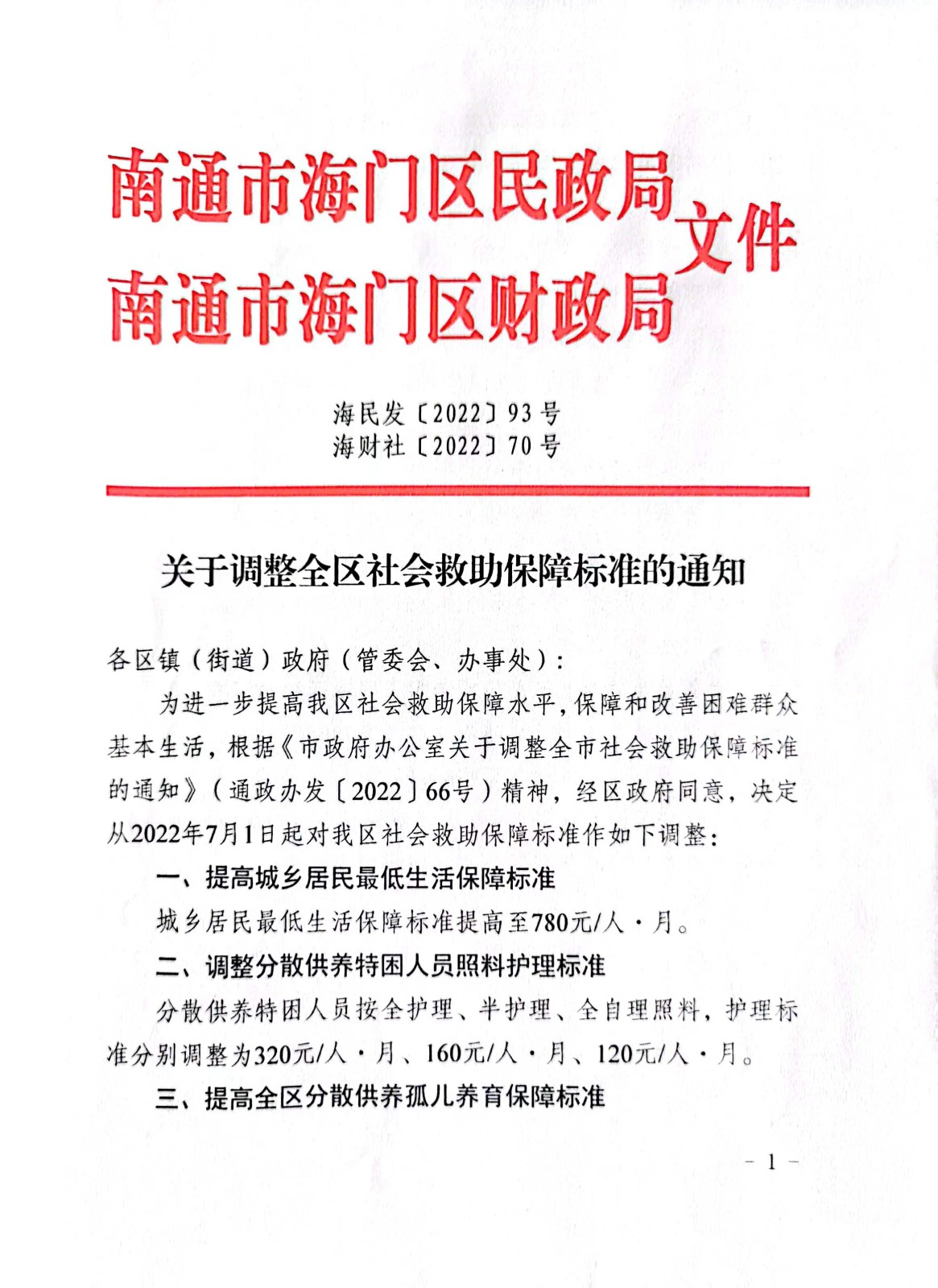 关于调整全区社会救助保障标准的通知
